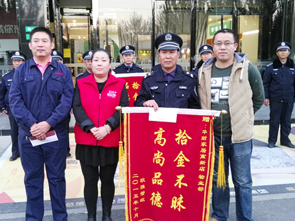 2015年10月23日18是許,保安李明寶在當日營業(yè)結束清場檢查時,在張家口華耐高新店商場南區(qū)3層衛(wèi)生間撿到1只皮挎包,立即教到物業(yè)部值班室,經值班人員共同檢查,內有包括汽車鑰匙、多張信用卡、駕駛證等物品。19時30分,失主前來尋找。次日上午,為感謝李明寶,失主專程送來“拾金不昧,品德高尚”錦旗一面。